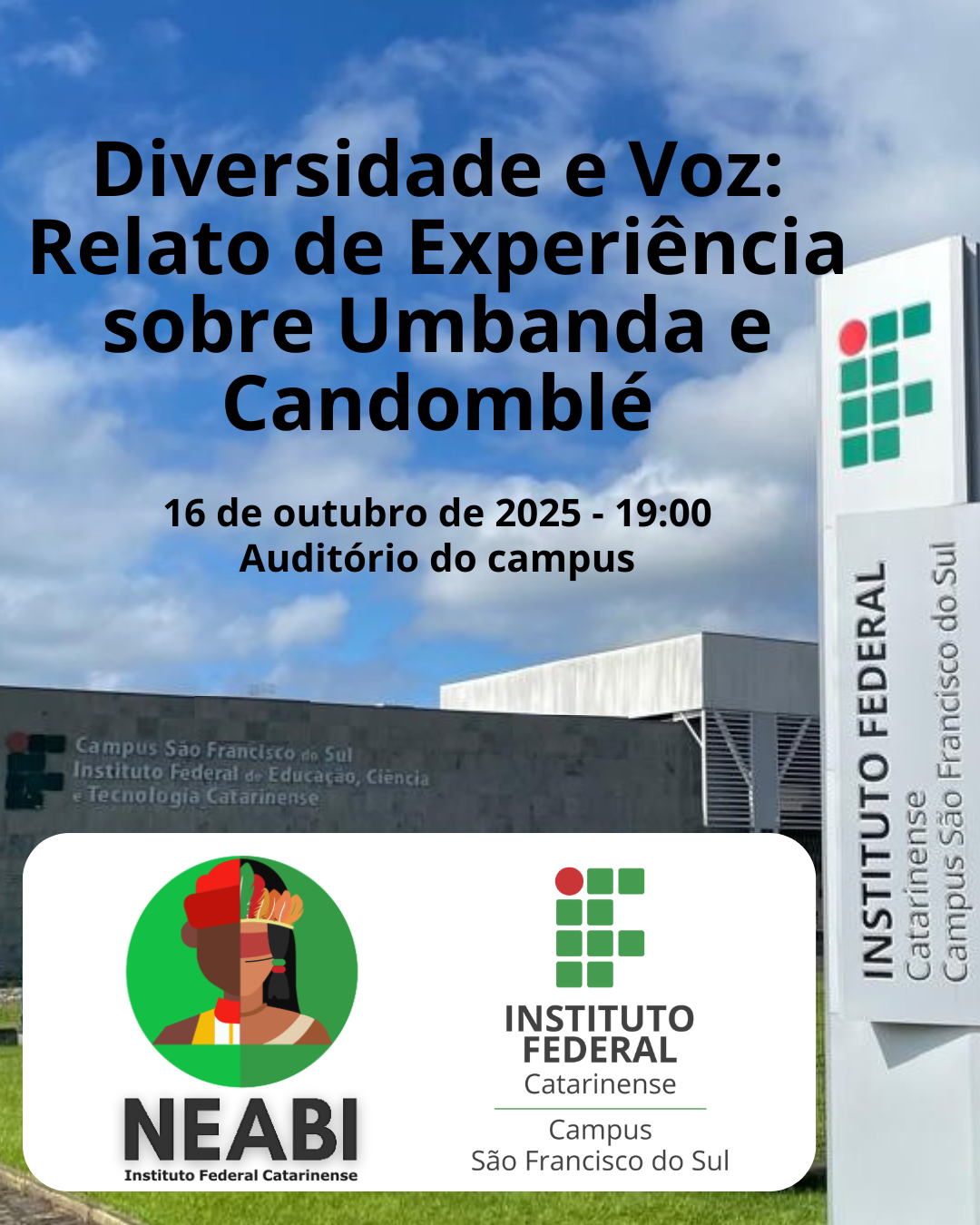O Núcleo de Estudos Afro-Brasileiros e Indígenas (NEABI) do Instituto Federal Catarinense – Campus São Francisco do Sul convida toda a comunidade acadêmica para a palestra “Diversidade e Voz: Relato de Experiência sobre Umbanda e Candomblé”, que será realizada no dia 16 de outubro de 2025, às 19:00, no auditório do campus.